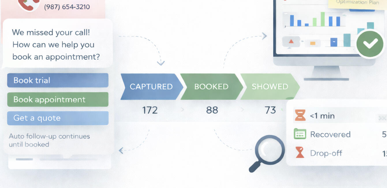We install a 24/7 missed-call capture and booking flow: if you miss a call, the caller gets an instant text with the right next step (book a trial, appointment, or quote), plus follow-up until booked or closed.