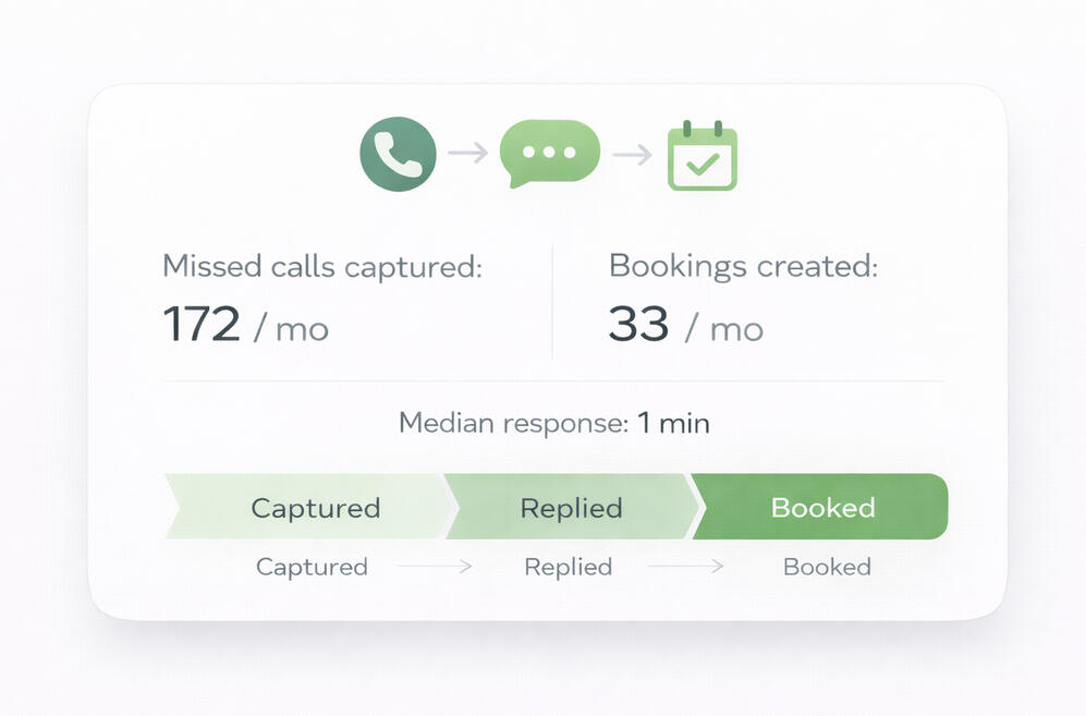 We install a 24/7 missed-call capture and booking flow: if you miss a call, the caller gets an instant text with the right next step (book a trial, appointment, or quote), plus follow-up until booked or closed.